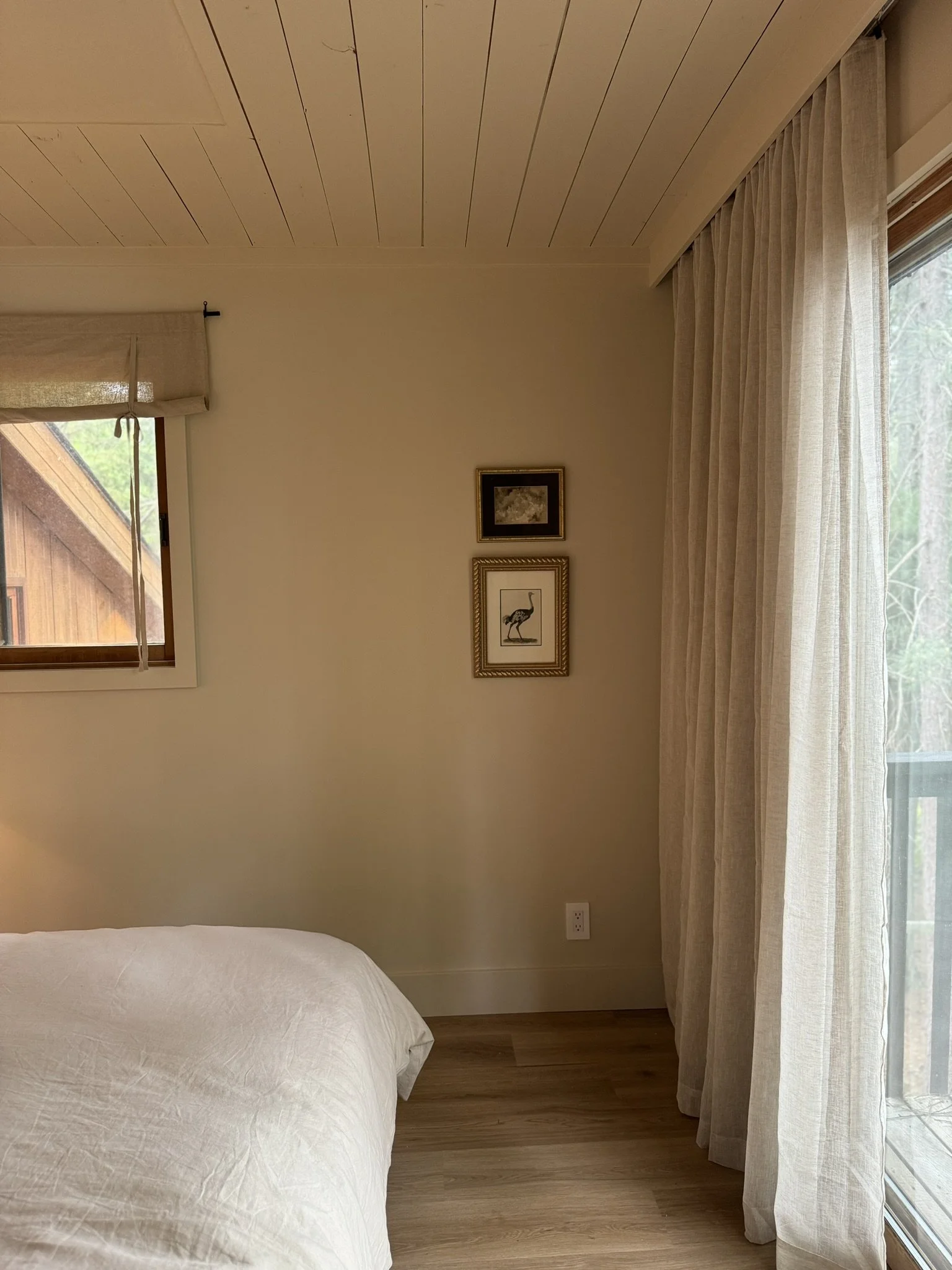 Bedroom Two, located upstairs has one king bed (with a brand new Bloom mattress). Features the most spectacular views of the lake and a walk-out balcony with seating. There is also a dresser and hanging rod for storage.