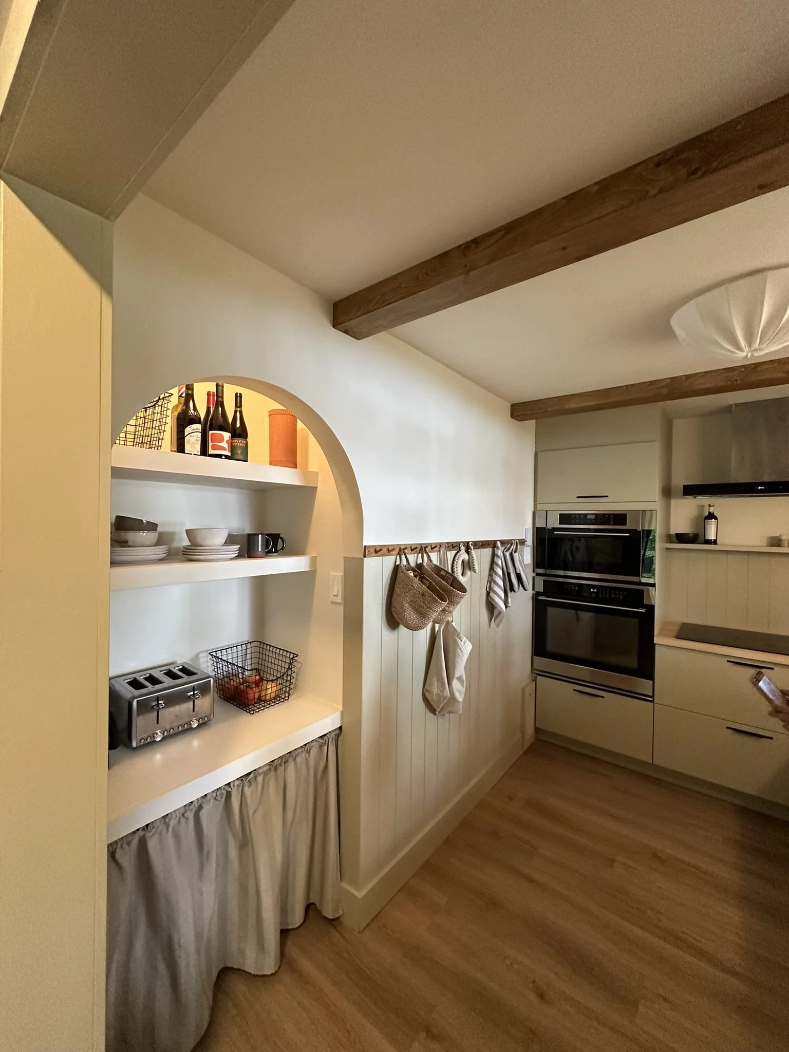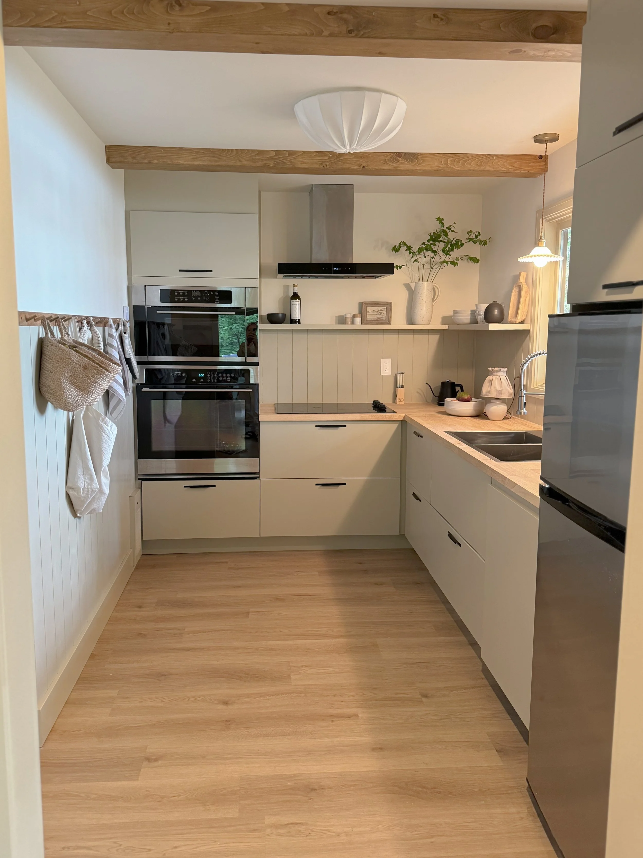Our newly renovated kitchen has a built-in oven and microwave, an electric stovetop and dishwasher. You’ll find all the necessary kitchen amenities: coffee maker, kettle, toaster, hand blender, pots, pans, dishes. You’ll also find salt, pepper, olive oil and COFFEE!