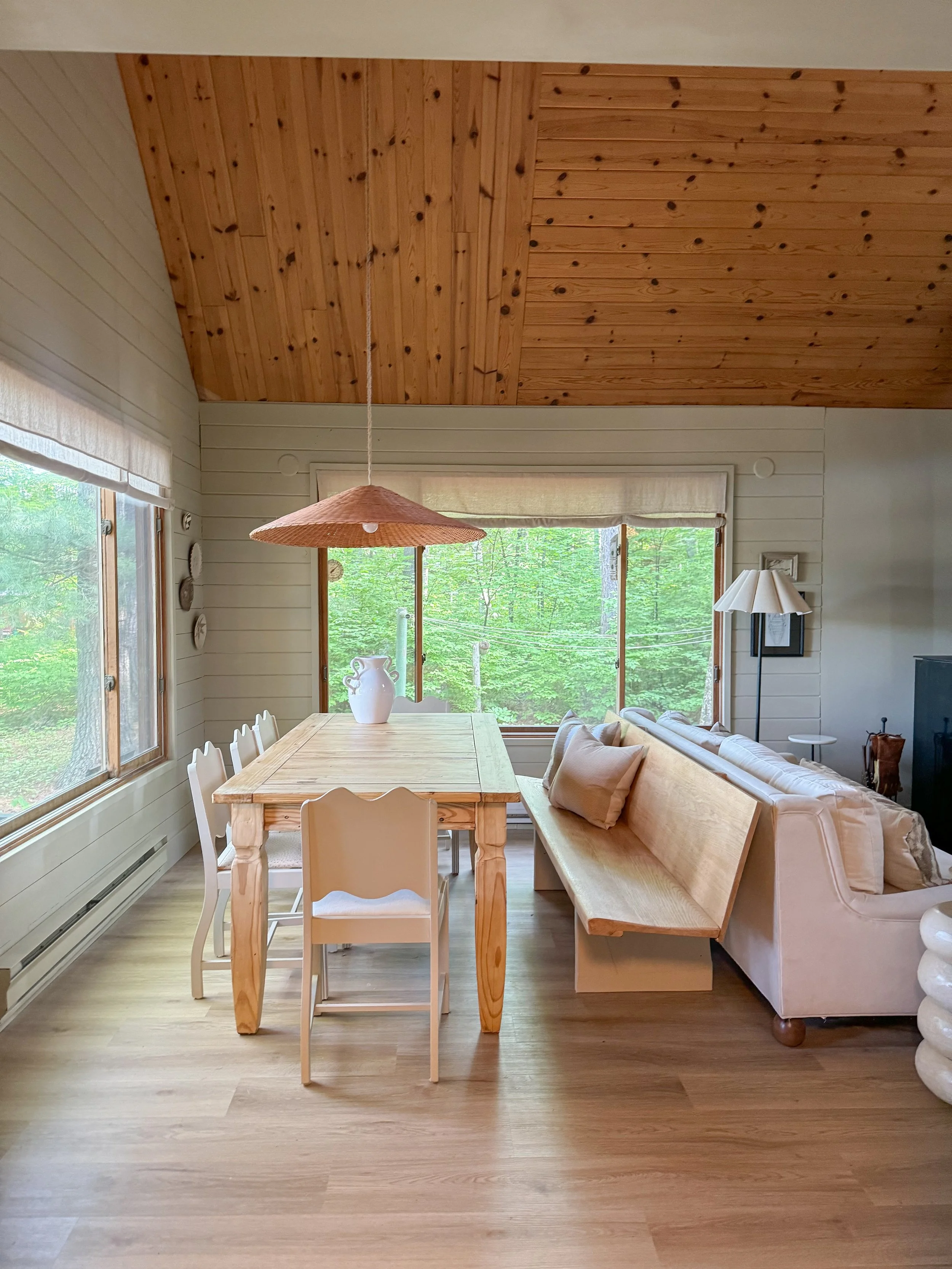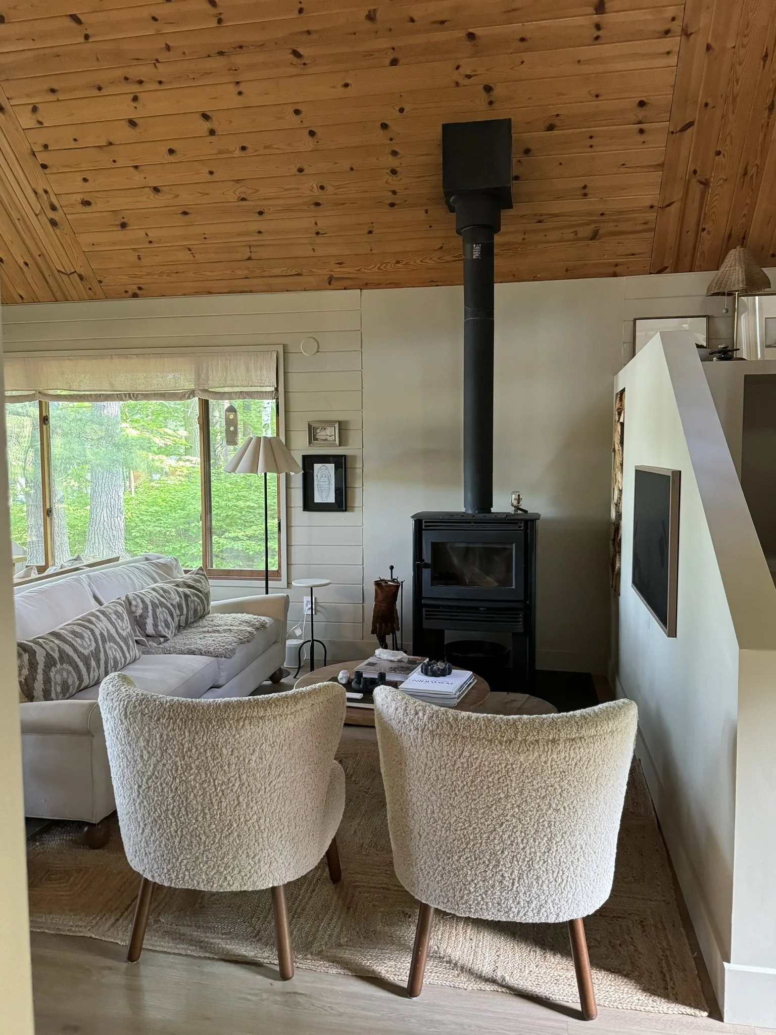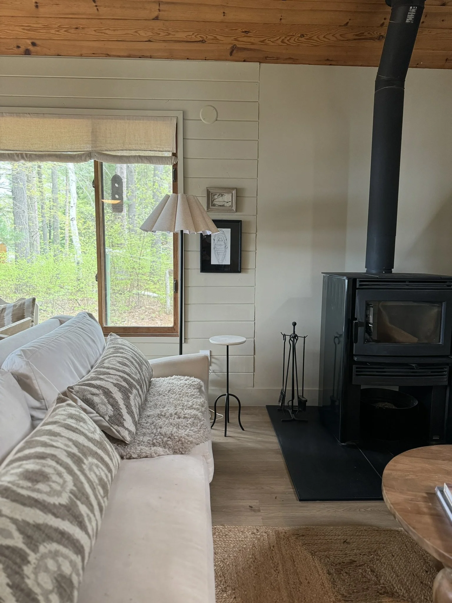 Living & Dining AreaA cozy open concept space with a dining table that overlooks the lake. Cuddle up on the couch in front of the brand new woodstove fireplace.